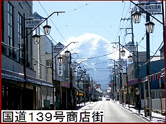 国道139号の商店街に入ると遥か彼方まで上り坂、その先に富士山が見える。