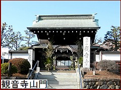 千人同心がらみをもう一カ所。「観音寺山門」(右)は千人同心の千人頭旗本中村左京の屋敷門を移築したと伝えられている。山門を入った目の前の本堂は大正時代(1912〜1926)の建築でそれほど古くは無いが屋根の上に巨大な擬宝珠が乗るのが珍しい。 |