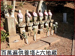 仁王門脇の「百萬遍供養塔と六地蔵」(右)は供養塔が寛政11年(1799)、六地蔵は天保2年(1831)の建立。地蔵様はお顔が割れたり摩滅していたりと、ちょっと痛々しい。 |