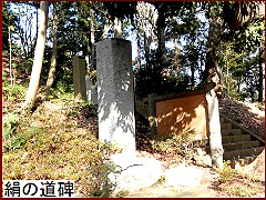 道標に従って数分、階段脇の石標は「絹の道碑」(左)。昭和32年(1957)に地元の有志によって建てられたもので この石碑によって絹の道という名称が一気に広まった。