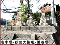 道路際にあったのは「秋葉大権現常夜灯」(右)。側面に札次大明神と刻まれており、後面には文化七年(1810)と刻まれているが、比較的新しいものなので再建されたのだろう。左の小さな石造は地蔵か? |