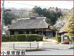 街道際の茅葺民家は有形民俗文化財の「小泉家屋敷」(左)。明治11年(1878)に再建されたもので木造平屋建て入母屋造り。現在も住居として使われているため中まで入ることはできない。