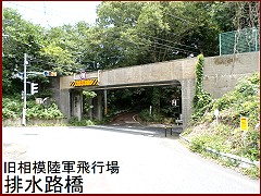 この丁字路を左へ曲がり集落を抜けると道路上をコンクリート橋が横切っているが、これは「旧相模陸軍飛行場の排水路橋」(右)。陸軍飛行場は舗装がされていなかったため雨天時はぬかるみとなってしまう。それを避けるために排水用として建設されたもの。今も雨水の排水用として使われているのだとか。 |