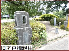 才戸橋を渡った右側の公園入口に「旧才戸橋の親柱」(右)が残されており、入り口を入った右側の石柱は才戸の渡し碑と大山道道標。 渡し碑には「・・・武蔵国八王子と矢名村(現秦野市)をつなぐ矢名街道の渡しで大山参詣道として大変な賑わいだった」とある。
