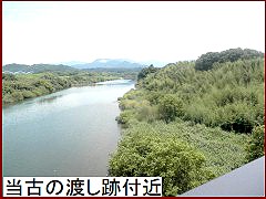 小倉橋を渡り10分ほど歩くと国道は左に曲がっていくが姫街道は真っ直ぐ。やがて豊川の土手上。この先に「当古の渡し」(左)があった。今は藪に阻まれ近づけないので国道に戻り当古橋から渡し跡付近を撮影したのが左写真。