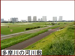 北野天満宮を出て多摩川の堤防に上がると左手に国道15号(第一京浜)の六郷橋が見え、右手に京浜急行の鉄橋が見える。鉄橋下を潜り、東海道線の鉄橋下も潜ると広々とした「河川敷の向うに何棟ものタワーマンションが見える」(左)。かつての京浜工業地帯だが すっかり景色が変わってしまった。