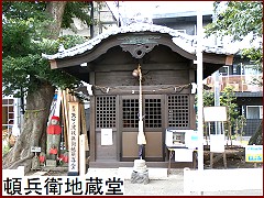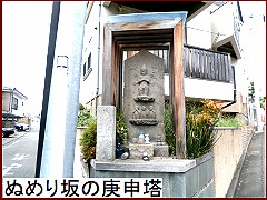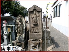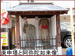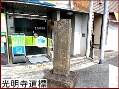 多摩川沿いを北進した筏道だがこの辺りはルートがはっきりしない。ということで しばらくは堤防上の道を歩く事に。かれこれ20分ほど歩いたら堤防を下り安養寺に寄り道を。江戸時代には古川薬師として人気があり行楽地となっていた。その門前に「古川薬師道 道標」(右)が建てられている。延宝2年(1674)に旧東海道の雑色から多摩川道に入る分岐点に建てられた道標だが区画整理のため現在地に移されたもの。 |