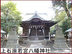 普通は八幡神社の祭神は応神天皇だが この神社はその皇子・仁徳天皇を祀っているので若宮八幡と称している。文化4年(1807)建築の本殿には素晴らしい彫刻が施されているそうだが見ることが出来ないのが残念。慶応4年(明治元年・1868)、甲陽鎮撫隊を率いた近藤勇は上石原村に到着すると神社の方向に拝礼し戦勝を祈願したという。