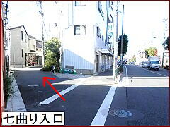 街道に戻りしばらく歩くと左へ入る細い道があるが此処が「七曲りの入口」(左)。 100メートルほどで現・五日市街道に戻るが こんどは反対側の道に入り白幡の坂を下っていく。