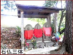 下り坂の途中に「石仏が三体」(右)。左右の地蔵菩薩は元禄11年(1698)と宝暦3年(1753)の建立。中央の馬頭観音は宝暦10年(1760)の建立。250年以上前の石仏だが今も大切にされているようだ。