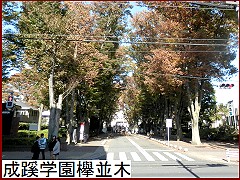 武蔵野八幡宮を出て十数分、「成蹊学園欅並木」(左)が見えてきた。 大正13年(1924)に植栽された当時の樹齢は30年ほどだったというから今は樹齢120年。思い切り伸びた枝が見事な樹形を作っている。