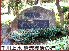 遊歩道を20分ほど歩くと「千川上水 清流復活の碑」(左)が。水流の途絶えた千川上水の補修作業が行われ平成元年(1989)に玉川上水を分流させることでかつての清流を復活。