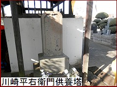 公園そばの真蔵院境内に「川崎平右衛門供養塔」(右)がある。 押立村の名主であった平右衛門は元文3年(1738)の大飢饉の際、私財を投じて村民を救助。その後も武蔵野新田八十二か村の復興に尽力したことから農民たちが生前の徳を偲んで寛政7年(1795)にこの供養塔を建立。