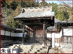 本堂前の「朱雀門(中門)」(右)は安永9年(1780)に建てられたもの。本柱の前後に控柱を持つ四脚(よつあし)門で正面軒下には見事な龍の彫り物が施されている。
