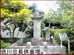 境内右手の石塔は「徳川忠長供養塔」(左)。この供養塔も忠長の妻・松孝院殿が建立したもの。