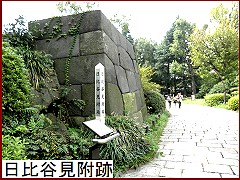 日比谷交差点側の入口から公園に入ると見える石垣は江戸城日比谷御門の一部。「日比谷見附跡」(左)と記された標柱と説明板が設置されている。
