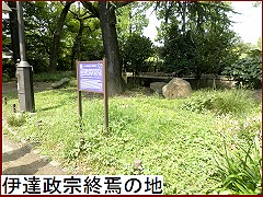 奥へ入ると心字池があり その奥は仙台藩伊達家の江戸上屋敷があった場所。一角に「伊達政宗終焉の地」(右)と記された説明板が。政宗がこの地で70年の生涯を閉じたのは寛永13年(1636)であった。 |