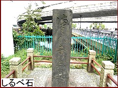 この周辺は大変な繁華街で迷子が多かったようだ。そこで町内の有志で作ったのが しるべ石。左右の窪みに迷子や尋ね人の特徴を記した紙を貼り告知したのだとか。 |