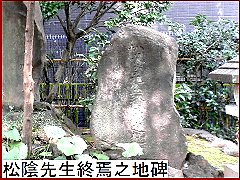 大老・井伊直弼による安政の大獄で捕えられた吉田松陰はここに送られ安政6年(1859)に処刑。享年30歳であった。「松陰先生終焉之地碑」(右)があるのは大安楽寺対面の十思公園内。 |