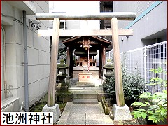街道に戻り次の十字路を右に曲がるとビルの谷間に小さな神社が。その名は「池洲神社」(左)。その昔、池洲屋敷の池から お稲荷様が出現。喜久井大納言なる人物が一宇を建立し池洲神社を創建したのだという。ところが喜久井大納言なる人物が皆目不明。