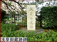 橋を渡ると植込みの中に「浅草見附跡碑」(右)が。ここは江戸36門の一つ、浅草御門があった場所。日光・奥州街道の重要な警護拠点として寛永13年(1636)に設けられた。 |