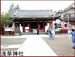 浅草寺まで来たら三社祭が有名な「浅草神社」(左)を素通りするわけにはいかない。 起源は浅草寺と同じ。明治初頭の神仏分離令で三社明神社となり後に浅草神社と改称。
