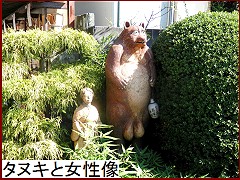しばらく歩いた先の東樹院本堂前に「タヌキと女性像」(右)が。この寺にはタヌキと美しい女性の伝説がある。