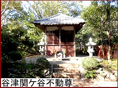 ほどなく「谷津関ケ谷不動尊」(右)の案内があるので左の道を下っていくと常夜灯の向うに御堂が。元々は不動山にあったのだが宅地開発の影響で現在地へ遷座。今でも初不動は大変な賑わいだそうだ。