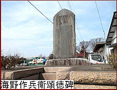 旧道に入って1〜2分、見上げるように大きな石碑は江戸時代初期に手賀沼の開拓を手がけた「海野作兵衛頌徳碑」(右)。洪水に悩まされた手賀沼に利根川へ排水するための流路を作り広大な水田を作り上げたという。 |