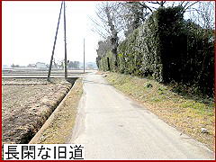 頌徳碑の先は家々が生垣に囲まれた発作新田集落の「長閑な道」(左)が続く。今は冬枯れで殺風景だが春になれば田に水が張られキラキラ輝く水面を眺めながらの街道歩きになるだろう。