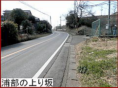 その先で旧道は行き止まり。 左へ曲がって県道59号に入り「浦部の上り坂」(右)を上っていくのだが歩道が無いので大型トラックが来ると怖わー。上りきった所で右に入り旧道に復帰。 |