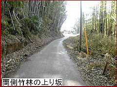 月影の井周辺は道が複雑に曲っているため分かりにくい。慎重に選んで歩くと程なく「両側竹林の上り坂」(左)。