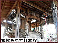 向った先は「富塚鳥見神社」(左)。文化9年(1812)建造の本殿が素晴らしい。庇柱には龍が巻きついた一木の彫刻が施され羽目板にも二十四孝(孝行が優れた人物24人)を題材にした彫刻が施されている。