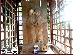 参道左の祠の中に「歓喜天」(右)という珍しい石造が安置されている。人身象頭の男女が抱擁するという双身像で明和8年(1771)の造立。 |
