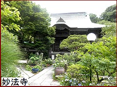 左折した奥の「妙法寺」(左)は日蓮聖人 縁の寺。日蓮が鎌倉に入り最初に草庵を結んだ場所がこの地。のちに護良親王の皇子である楞厳丸(りょうごんまる)が父母の供養のためこの寺を建てたという。