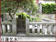 名越切通しを越えて鎌倉に入った日蓮が水が飲みたくなり持っていた杖で地面を突きさすと水が湧き出したという。後ろの題目碑に刻まれた文字は「南無妙法蓮華経日蓮水」。