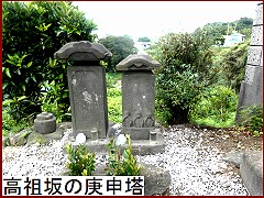 その先の県道を横断し高祖坂を上ると三面の馬頭観音と石塔が2基。石塔の右側は「高祖坂の庚申塔」(右)と呼ばれているが三猿の上に文字が刻まれた文字庚申塔で元禄7年(1694)の造立。 |