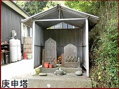 数分歩くと祠のなかに「庚申塔」(右)が2基。この2基も文字庚申塔だが造立年などの文字は読み取れない。