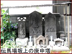 池上小学校先から坂道を上っていくと「伝馬場坂上の庚申塔」(左)が3基並んでいる。