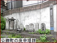 法塔十字路から4~5分、駐車場脇に並ぶのは「公卿町の庚申塔群」(左)。8基並んでいるが最奥の庚申塔は寛永16年(1639)のもので横須賀市内最古。ちなみに市内には約千基の庚申塔があるそうだ。
