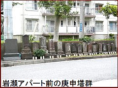 さらに7~8分、市営岩瀬アパートの前に並んでいるのは「15基の庚申塔」(右)。一番古い庚申塔は天明8年(1788)だが昭和7年(1932)建立の庚申塔には、なんと昭和15年、昭和25年など複数年の奉納日が刻まれている。 |