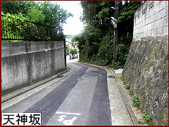 アパート群の間を右に曲がりしばらく歩くと「天神坂」(左)と呼ばれる下り坂。