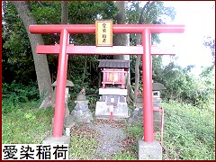 天神坂解説板前の路地を入ると「愛染稲荷」(右)という小さな神社がある。文化14年(1817)、天神坂に住んでいた七兵衛という人物が江戸加賀町の愛染寺より証書を受け稲の豊作を願って建立したという。 |