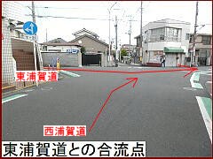 100mほど先の十字路が東海道保土ヶ谷宿を出発し金沢八景を通ってきた「東浦賀道との合流点」(右)。