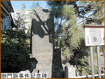 その高橋定右衛門は明治3年(1870)の御門訴事件で獄死した犠牲者。定右衛門の墓は路地奥の墓地内。この事件は品川県(当時)が発した貯穀制度に反対する野中新田など12カ村の農民の直訴事件。「御門訴事件記念碑」(右)が五日市街道の武蔵野市八幡町に建てられている。関連文章はこちら |