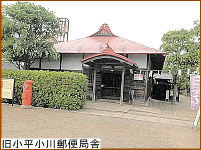 西武線の踏切を渡ってすぐに右へ入ると 小平ふるさと村 があるのでちょっと寄り道を。正面入り口脇の赤い屋根の建物は「旧小平小川郵便局舎」(左)。明治41年(1908)に建てられ昭和58年(1983)まで現役で使われていた。昭和初期には電話交換業務も行っていた。