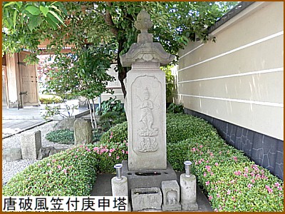 山門脇に建てられている「庚申塔」(右)は一般的な庚申塔とはちょっと違う。嘉永3年(1850)の造立だが、青面金剛のお顔は憤怒の相ではなく柔和で笑っているような。三猿も烏帽子をかぶり狩衣を付けている。さらには扇を持ったり鈴を持ったり御幣を担いだ猿も。 |