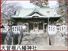 氷川大明神を出てかれこれ30分、街道際の大きな鳥居の奥は「大曾根八幡神社」(左)。文亀2年(1502)に勧請された神社だが後三年の役で源義光が兄源義家援軍のため寛治元年(1087)に綾瀬川を渡り大曾根の地を経て東国に赴いた頃より八幡神が奉斎されていたとの説もある。