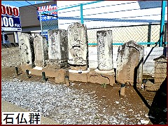 (右)が並んでいるが その内5基は庚申塔。左側は地蔵尊だが右側の小さい石塔は比較的珍しい 疱瘡神。悪神とされる疱瘡神であるが、一方で、祈ると疱瘡から免れるという。かつてこのあたりで疱瘡が流行ったのだろうか。