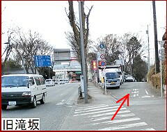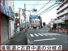 このすぐ先で道は二又に分かれるがここは「滝坂道と古府中道の分岐点」(右)。右に曲がっていく道が古府中道で京王線八幡山駅を越え人見街道に入って府中へ向かっていた。滝坂道は真っ直ぐ進み荒玉水道道路を横切り八幡社前に繋がっていたのだが区画整理が行われ今は一部が消滅状態。 |